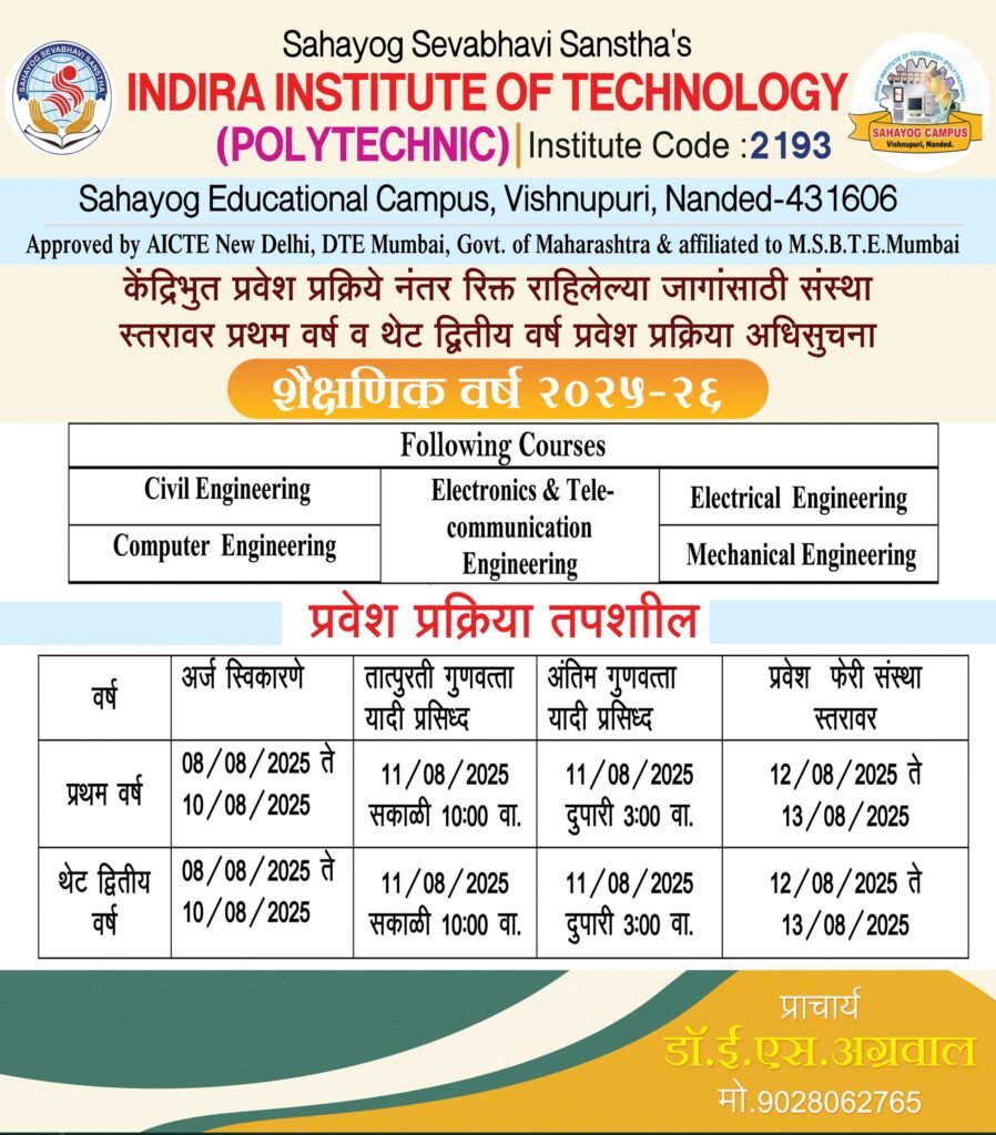 इंदिरा इन्स्टिट्यूट ऑफ टेक्नॉलॉजी (पॉलीटेक्निक) या नामांकित संस्थेत प्रथमच पाऊल टाकणाऱ्या आपल्या सर्व नवोदित विद्यार्थ्यांचे मन:पूर्वक स्वागत करताना मला अतिशय आनंद होत आहे.